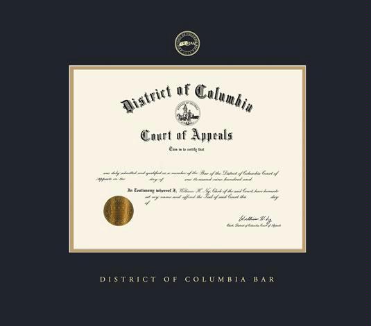 District of Columbia Bar Certificate Frame with Black and Gold Double Mat and Gold Embossing
