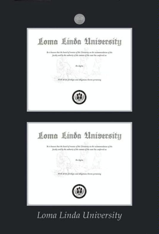 Loma Linda University Double Diploma - BA/MA (7/08 to Present) with Medallion Frame. Featuring a Black and Silver Double Mat with Silver Embossing