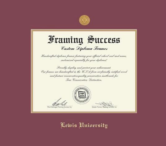 Lewis University Diploma Frame with Medallion and Maroon and Gold Double Mat and Gold Embossing