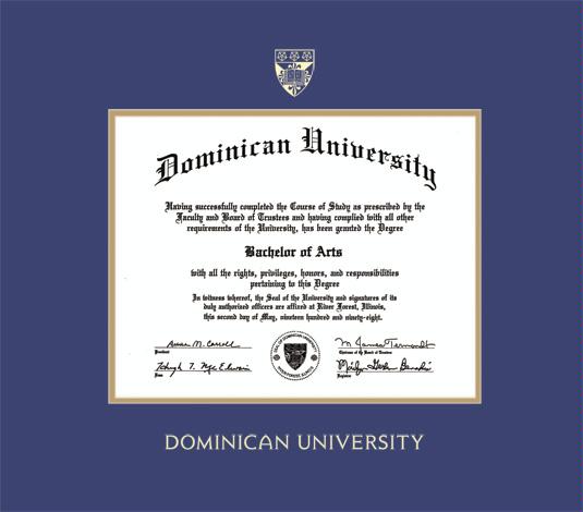 Dominican University Diploma Frame with Royal Blue and Gold Double Mat and Gold Embossing