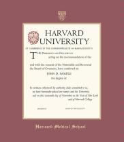 Harvard University Medical Residency Certificate with Medical School Medallion Frame with Maroon and Gold Double Mat and Gold Embossing(Approximate frame size 19 x 22 inches)