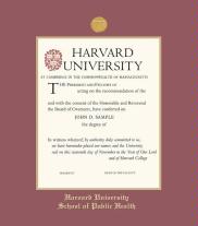 Harvard University Diploma - School of Public Health (3/15 to Present) Frame with Maroon and Gold Double Mat and Gold Embossing(Approximate frame size 19 x 22 inches)