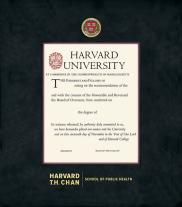 Harvard University Diploma - T. H. Chan Public Health with Colored Medallion Frame with Black Suede and Wood Fillet Double Mat and Gold Embossing(Approximate frame size 19 x 22 inches)