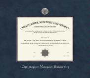 Christopher Newport University Diploma Frame with Medallion and Navy Blue Suede and Wood Fillet Double Mat and Silver Embossing(Approximate frame size 19 x 22 inches)