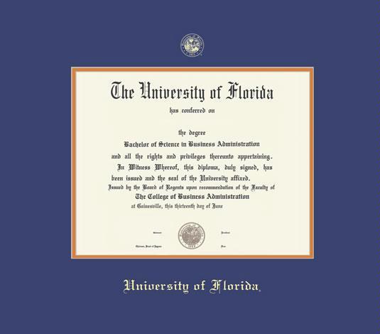 University of Florida Diploma Frame with Royal Blue and Orange Double Mat and Gold Embossing
