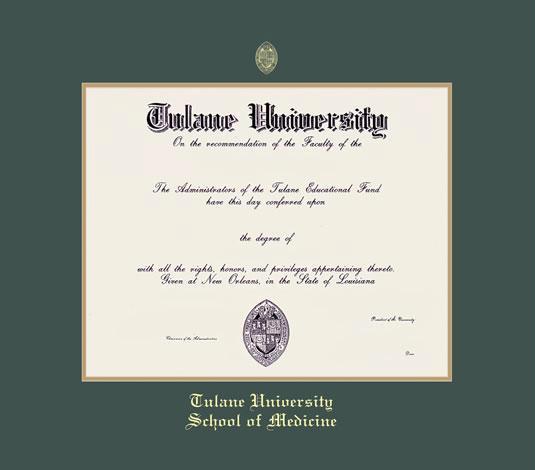 Tulane University Diploma - School of Medicine Frame with Green and Gold Double Mat and Gold Embossing