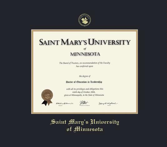 Saint Mary's University of Minnesota Diploma - BA/MA/Doc (6/09 to 6/22) Frame with Black and Gold Double Mat and Gold Embossing