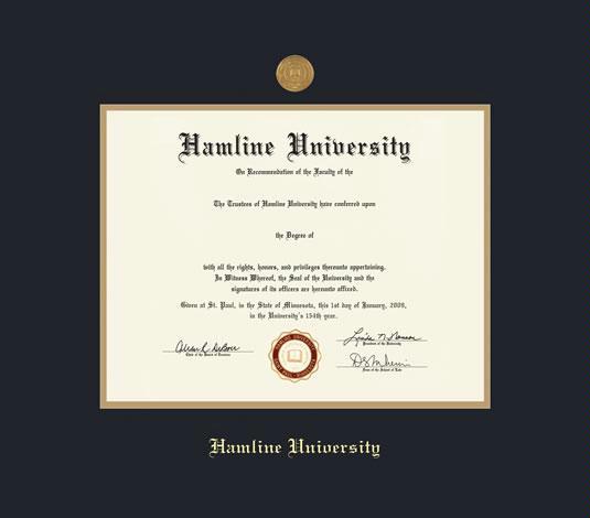 Hamline University Diploma - BA/MA Frame with Medallion and Black and Gold Double Mat and Gold Embossing