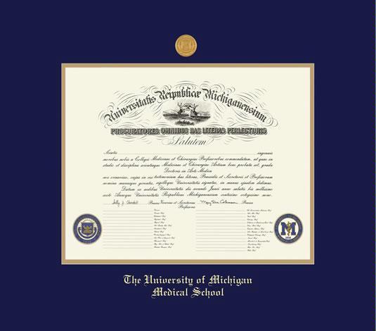 University of Michigan Diploma - Medical with Medallion Frame Featuring a Navy Blue and Gold Double Mat with Gold Embossing