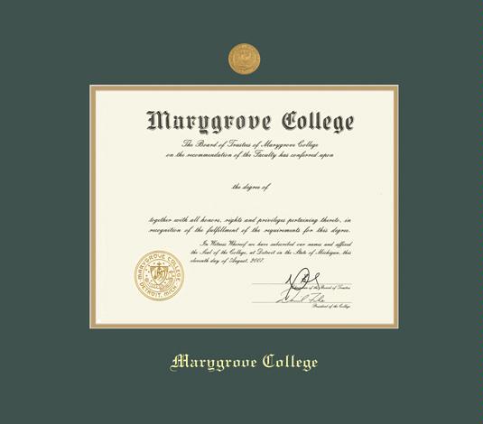 Marygrove College Diploma Frame with Medallion and Green and Gold Double Mat and Gold Embossing