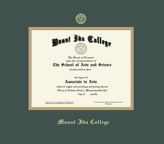 Mount Ida College Diploma Frame with Green and Gold Double Mat and Gold Embossing