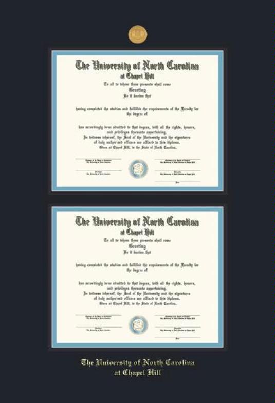 University of North Carolina at Chapel Hill Double Diploma Frame with Medallion and Black and Light Blue Double Mat and Gold Embossing