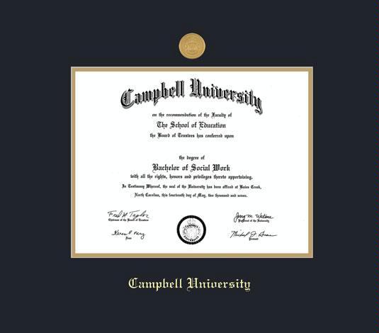 Campbell University Diploma (10/05 to Present) Frame with Medallion and Black and Gold Double Mat and Gold Embossing