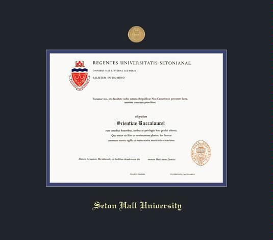 Seton Hall University Diploma Frame (12/09 to Present and Pre 5/05) with Medallion and Black and Royal Blue Double Mat and Gold Embossing