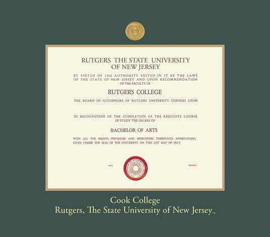 Rutgers University Diploma - Cook College with Medallion Frame Featuring a Green and Gold Double Mat with Gold Embossing