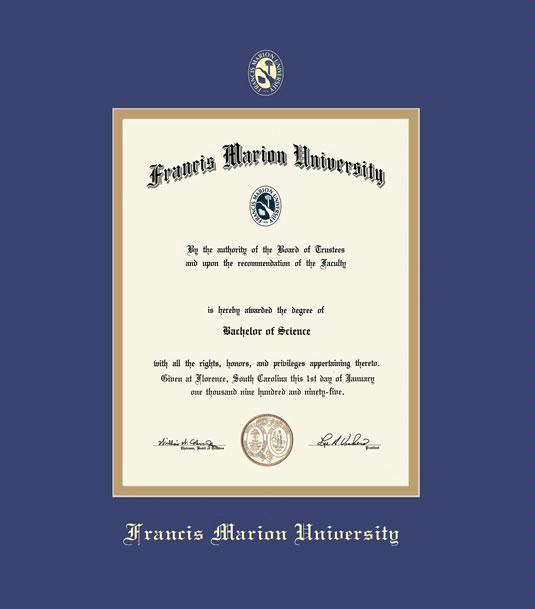 Francis Marion University Diploma Frame with Royal Blue and Gold Double Mat and Gold Embossing