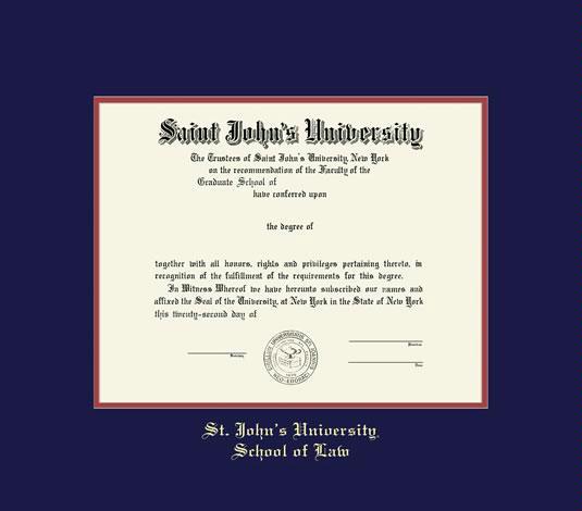 St. John's University in N.Y. Diploma - Law (7/04 to Present) Frame with Navy Blue and Red Double Mat and Gold Embossing