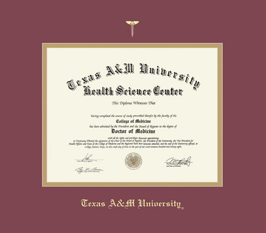 Texas A & M University Diploma - MD (with Medical Staff Seal) Frame with Maroon and Gold Double Mat and Gold Embossing