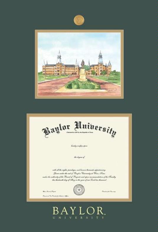 Baylor University Diploma and Lithograph Frame with Medallion and Green and Gold Double Mat and Gold Embossing