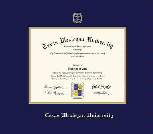 Texas Wesleyan University Diploma - BA (Pre 2022) Frame with Navy Blue and Gold Double Mat and Gold Embossing