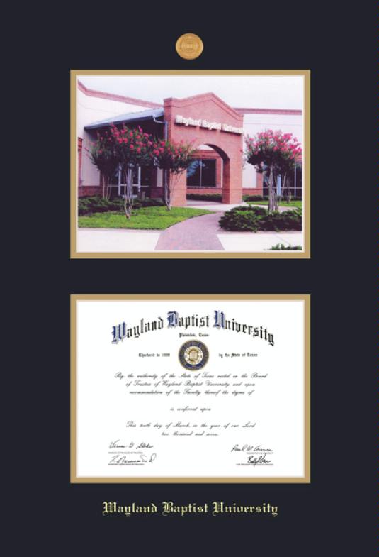 Wayland Baptist University Diploma and Photo Frame with Medallion and Black and Gold Double Mat and Gold Embossing