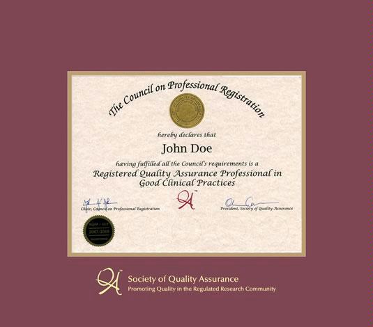 Society of Quality Assurance Certificate Frame with Maroon and Gold Double Mat and Gold Embossing