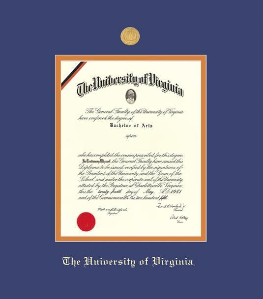 University of Virginia Diploma Frame with Medallion and Royal Blue and Orange Double Mat and Gold Embossing