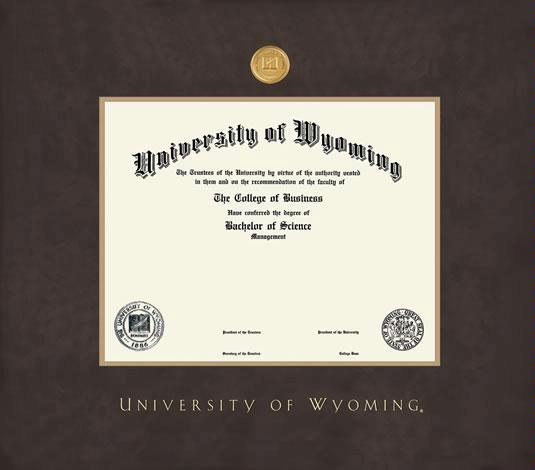 University of Wyoming Diploma - BA/MA/PhD Frame with Medallion and Brown Suede and Gold Double Mat and Gold Embossing