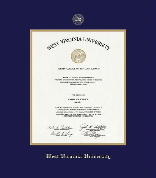 West Virginia University- Downtown Campus Diploma (Pre 6/19) Frame with Navy Blue and Gold Double Mat and Gold Embossing