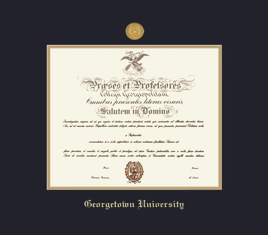Georgetown University Diploma Frame with Medallion and Black and Gold Double Mat and Gold Embossing