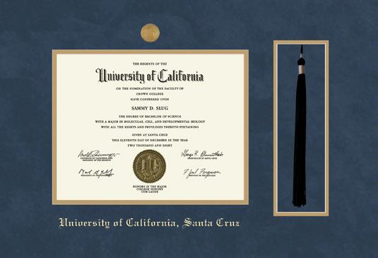 University of California, Santa Cruz Diploma Frame with Medallion and Tassel Cut-out and Navy Blue Suede and Gold Double Mat and Gold Embossing