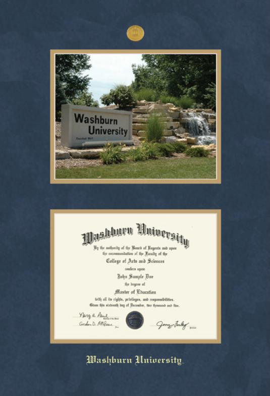 Washburn University Diploma and Photo Frame with Medallion and Navy Blue Suede and Gold Double Mat and Gold Embossing