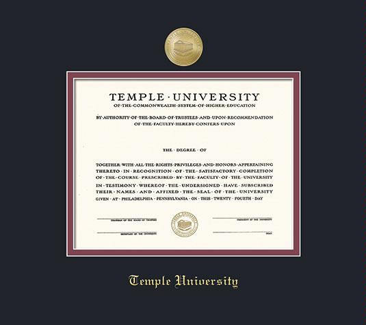 Temple University Diploma - All except Dental (2023 to Present & Pre 1/09) Frame with Medallion and Black and Maroon Double Mat and Gold Embossing