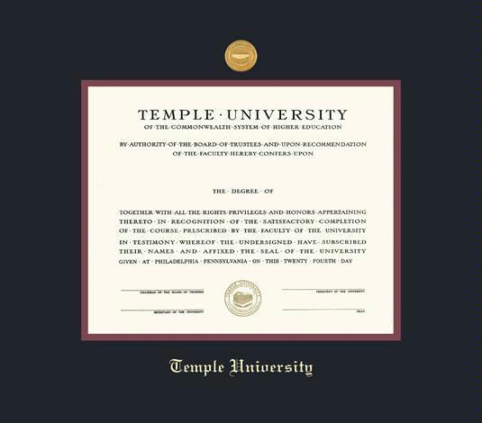 Temple University Diploma-(Pre 2023) BA/MA/LLM/PhD/Pharmacy/Nursing/Law/MD/Doc & Current Dental with Medallion Frame Featuring a Black and Maroon Double Mat with Gold Embossing