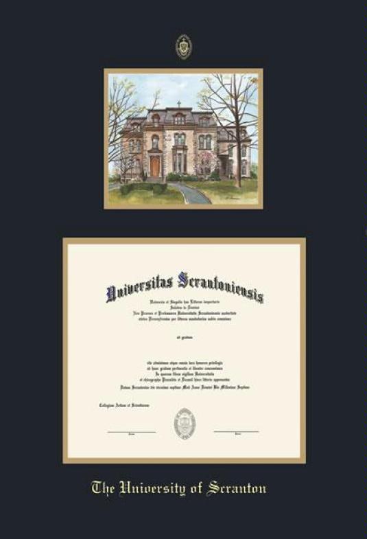 The University of Scranton Diploma - BA and Lithograph Frame with Black and Gold Double Mat and Gold Embossing