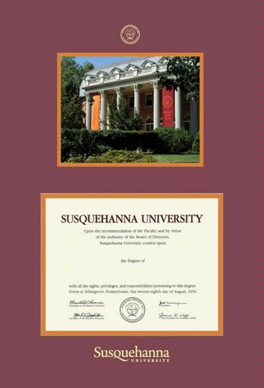 Susquehanna University Diploma (6/09 to Present) with Photo Frame Featuring a Maroon and Orange Double Mat with Gold Embossing