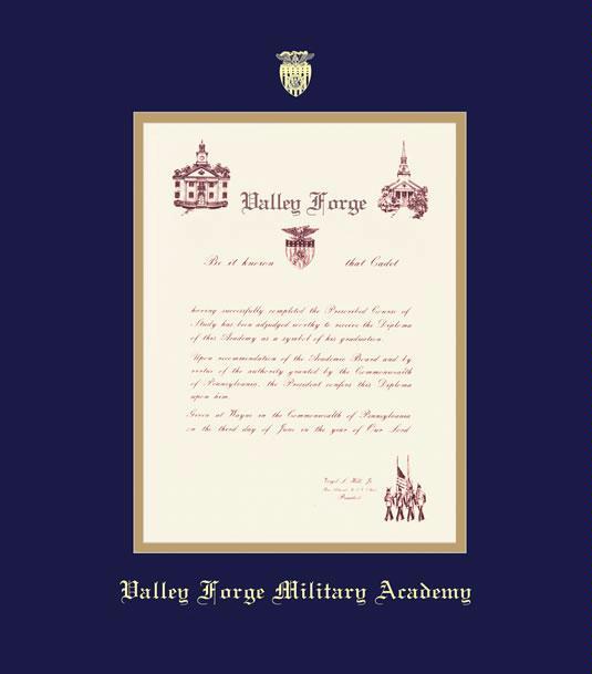 Valley Forge Military Academy Diploma Frame with Navy Blue and Gold Double Mat and Gold Embossing