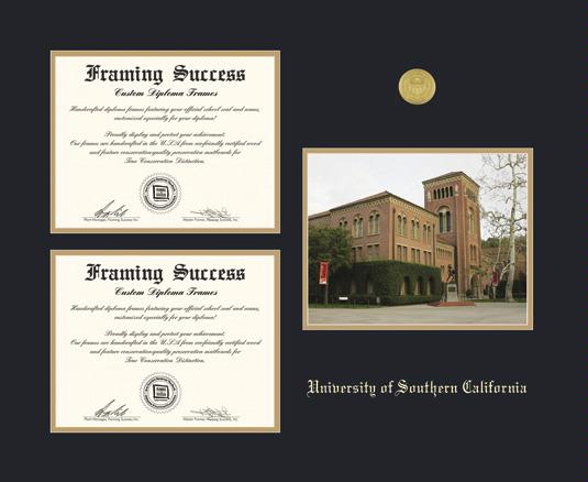 University of Southern California Double Diploma with Bovard Photo Frame with Medallion and Black and Gold Double Mat and Gold Embossing