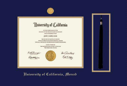 University of California, Merced Diploma Frame with Medallion and Tassel Cut-out and Navy Blue and Gold Double Mat and Gold Embossing