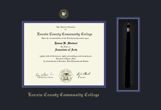Lorain County Community College Diploma Frame with Tassel Cut-out and Black and Royal Blue Double Mat and Gold Embossing