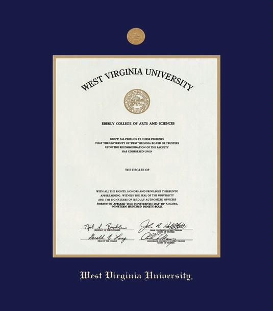 West Virginia University- Downtown Campus Diploma (Pre 6/19) Frame with Medallion and Navy Blue and Gold Double Mat and Gold Embossing