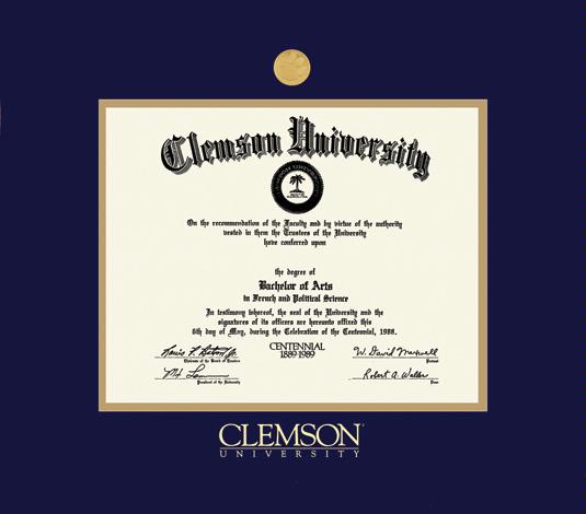Clemson University Diploma Frame with Tiger Paw Medallion and Navy Blue and Gold Double Mat and Gold Embossing