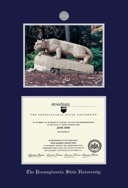 Pennsylvania State University Diploma with Nittany Lion Photo Frame with Medallion and Navy Blue and Silver Double Mat and Silver Embossing