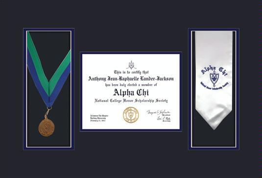 Alpha Chi National College Honor Scholarship Society Certificate with Stole, Medallion or Cord Opening Frame with Black and Royal Blue Double Mat and No Embossing