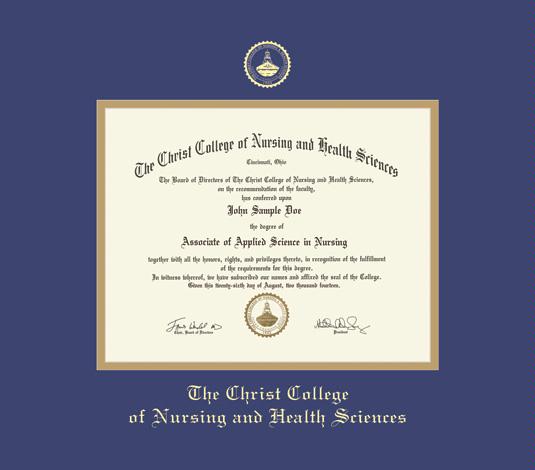 The Christ College of Nursing and Health Sciences Diploma (2008 to Present) Frame with Royal Blue and Gold Double Mat and Gold Embossing