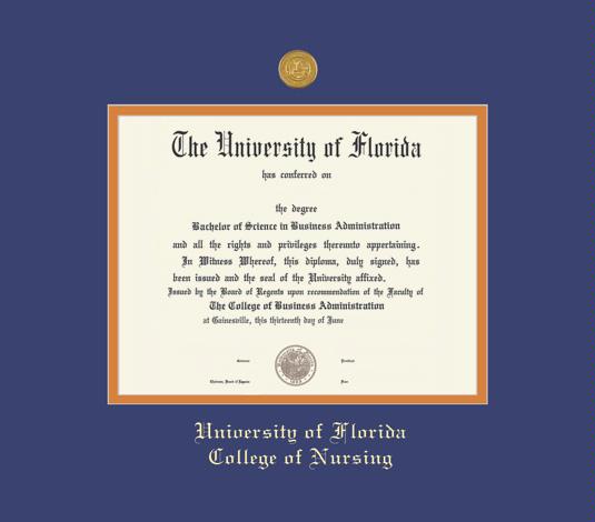University of Florida Diploma - College of Nursing Frame with Medallion and Royal Blue and Orange Double Mat and Gold Embossing