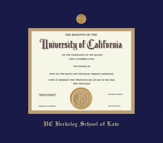 University of California- Berkeley Diploma - Law (1/15 to Present) Frame with Medallion and Navy Blue and Gold Double Mat and Gold Embossing