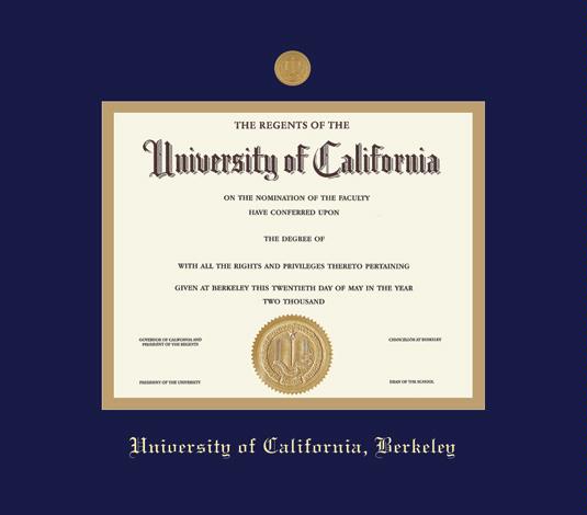 University of California- Berkeley Diploma - BA/MA/PhD (1/15 to Present) Frame with Medallion and Navy Blue and Gold Double Mat and Gold Embossing
