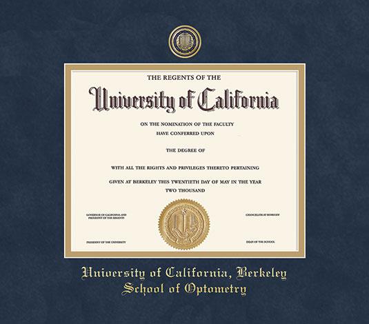 University of California- Berkeley Diploma - School of Optometry Frame with Medallion and Navy Blue Suede and Gold Double Mat and Gold Embossing