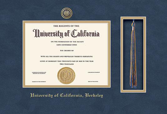 University of California- Berkeley Diploma - BA/MA/PhD Frame with Medallion and Tassel Cut-out and Navy Blue Suede and Gold Double Mat and Gold Embossing